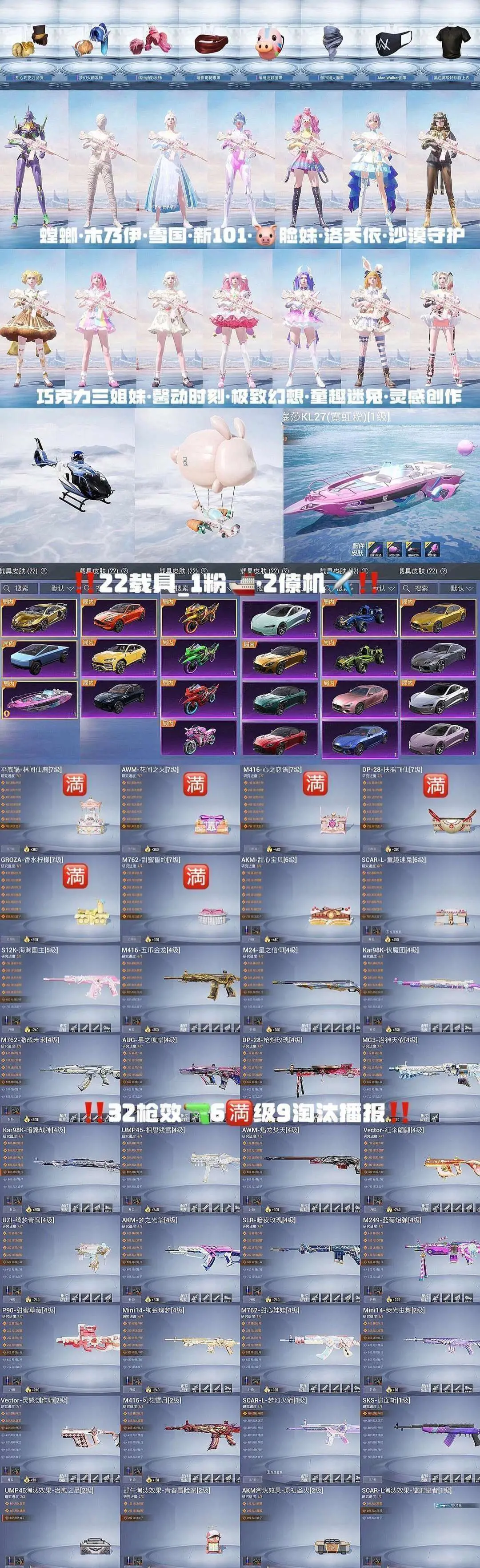 本游戏账号:特效枪数量40个,粉装数量125套,载具数量31个,优质装备有: AKM-甜心宝贝, M416-五爪金龙, M416-心之恋语, M762-甜蜜誓约, AKM-梦之光华, AUG-星之彼岸, M416-风花雪月, M762-激战未来, 套装-缤纷油彩, 套装-极致幻想, 套装-心之恋语, 套装-星空之魅, 套装-甜蜜誓约, 套装-冰霜白皇, 极限特训降落伞, 心之恋语降落伞, 星之信仰降落伞, 春暖花开降落伞, 暗夜玫瑰降落伞, 合金龙骨(蓝), 合金龙骨(绿), 阿斯顿·马丁DBS(红)等,供您畅选,感受良好游戏体验!